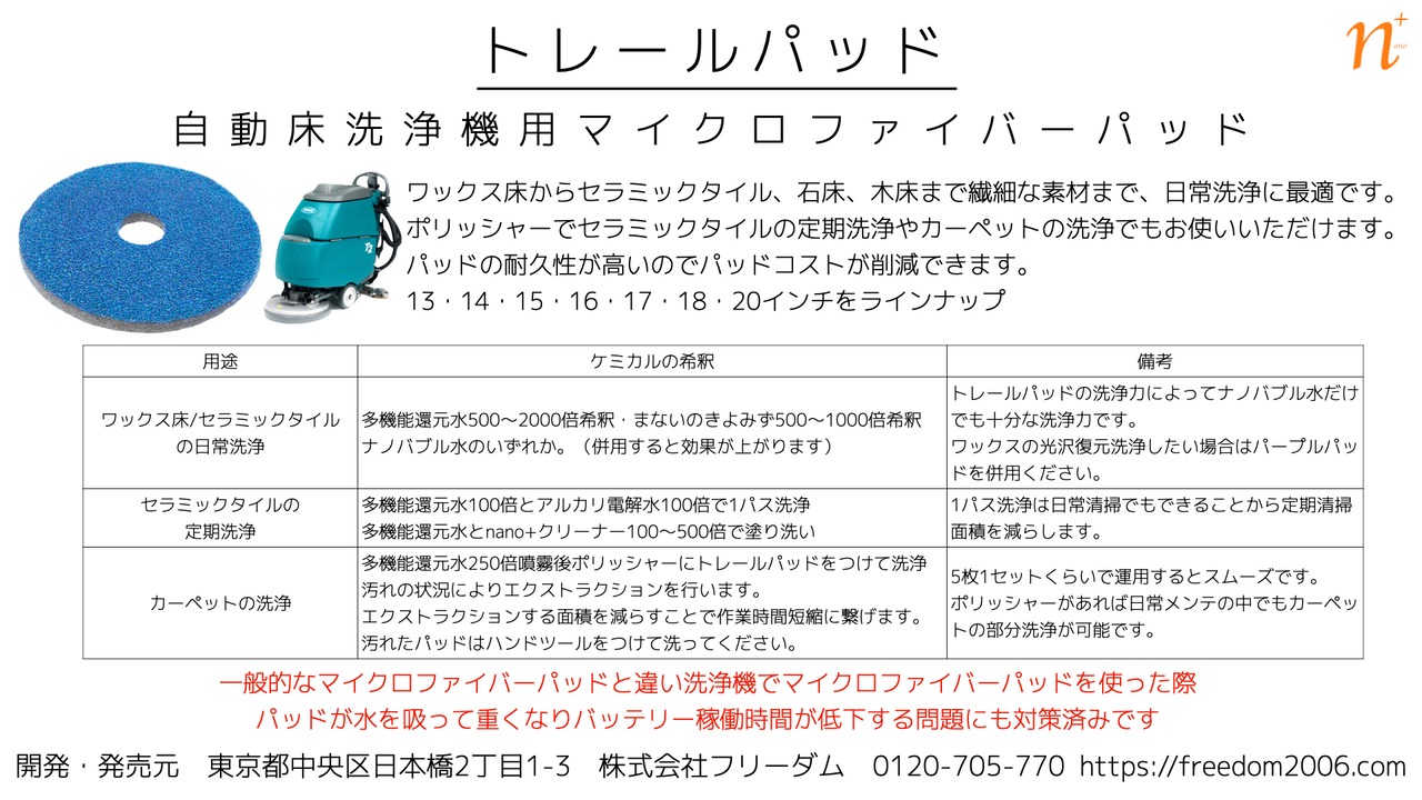 白パッド+マイクロファイバー生地になっているので、繊維が水分を吸って重くなり、パッドモーターの負荷が増え稼働時間が落ちる現象が起こりにくいため、自動床洗浄機でも安心してお使いいただけます。